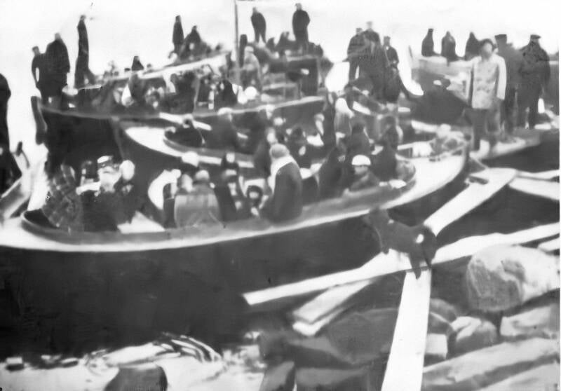 Tämä on ainoa lähtöpäivältä säilynyt valokuva, veneet viemässä väkeä laivaan. Saaren hyljekoista toiset lopetettiin, toiset jäivät kotiportaille uskollisesti odottamaan kotiin kohta palaavia – olivathan isännät ja emännät aina tulleet matkoiltaan. Jotkut ehkä epäilivät, ja ne tulivat mukaan laiturille kuten tämän kuvan koira. Heiluttaako se vielä toiveikkaana häntäänsä? Mukaan sekään ei kuitenkaan päässyt...